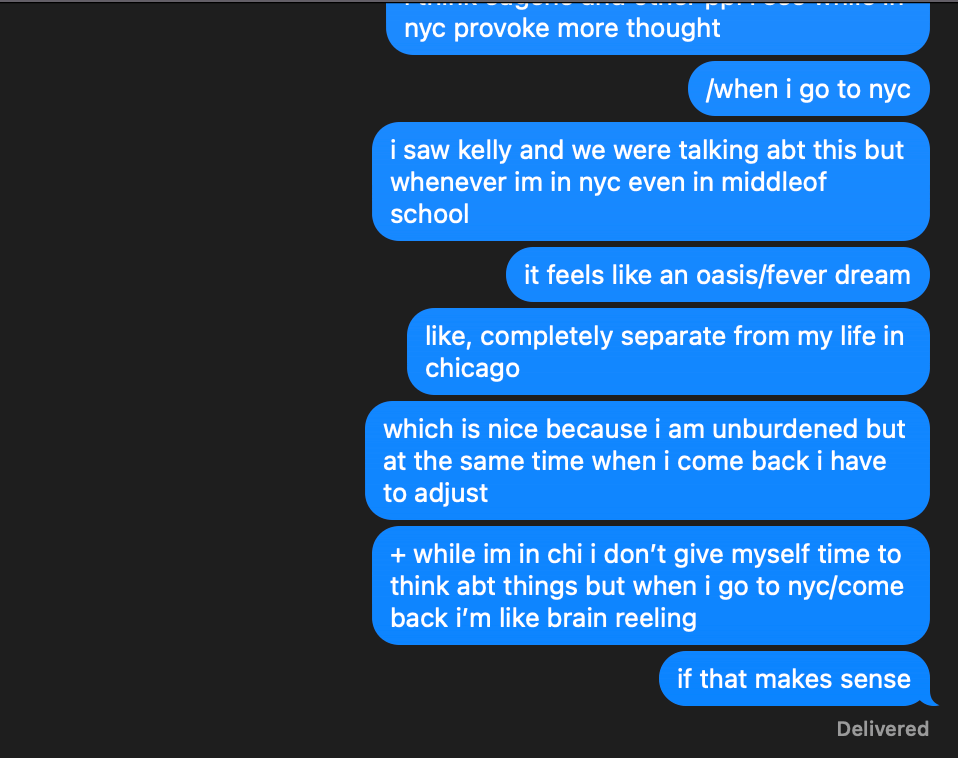 I love Chicago, I love magnolias, I (have a) love (-hate relationship with) spring, April. The city that I grew up in, that’s become home – I’ll always be here, comfortably, safely. At the same time, I know that my time here is marked by dates; my quarters, which are 9 weeks (10 including finals) are split into deadlines, which makes time accelerate much faster. While my entire life is here – all the people I feel closest to, the tasks and miscellaneous things that give me meaning, the landscapes that I understand – I feel, all the same, that my life is suspended in time while in Chicago. Very rarely do I ever get, or give myself, an opportunity to stop and think about what I’m doing, what I’m working towards, what I feel; as someone who’s grown up around people that, and who herself, values deep introspection and intentionality around their thoughts, words, actions.. this way of life has become frighteningly too easy for me to adapt to. To put a damper on such profound feelings that were so highly revered in earlier years of my own life is terrifying; perhaps that’s why I am able to appreciate so my time in New York.