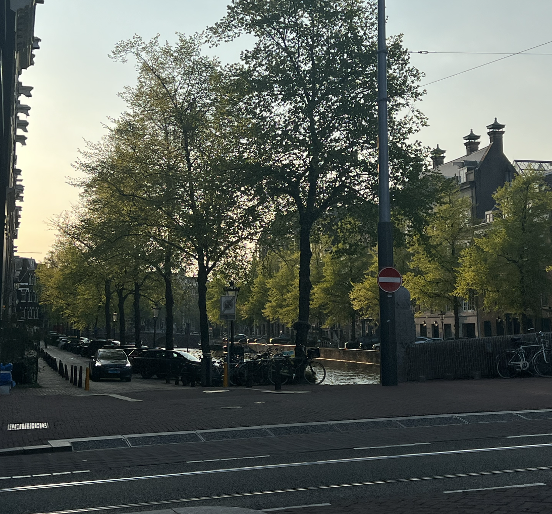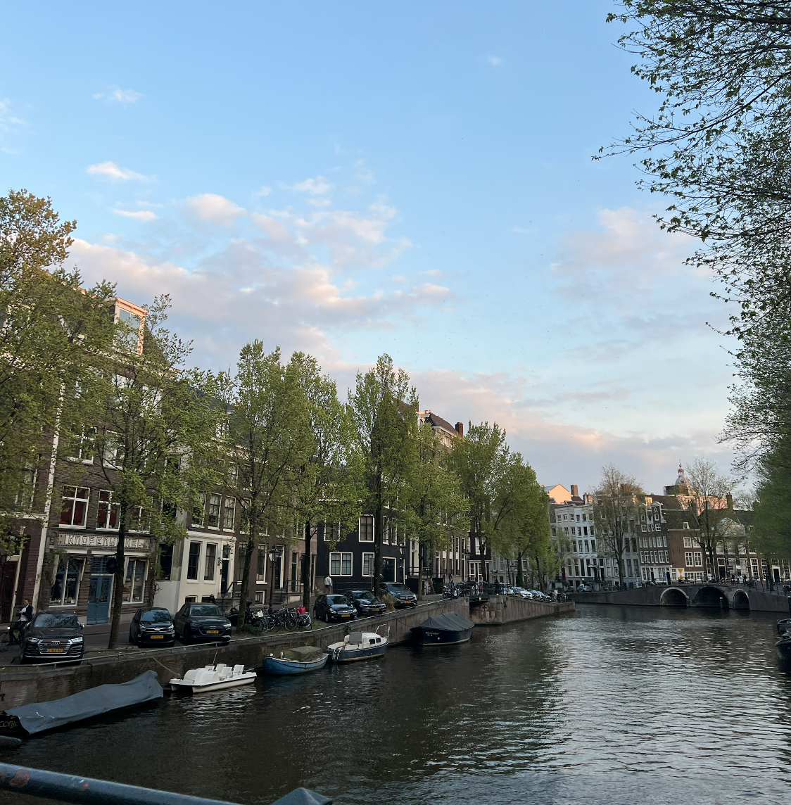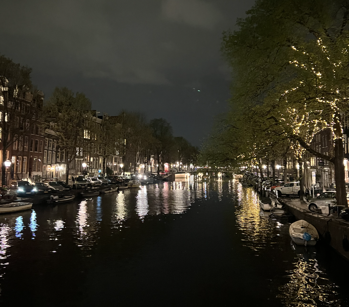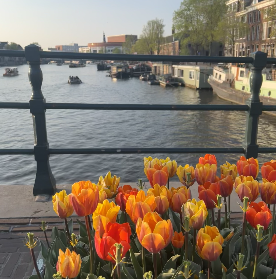 flying in, being picked up by J and BJ at the train station, going to convention center to meet the others, walking down the wider streets, seeing Dutch tulips for the first time, canal fascination, stumbling upon a flower shop, feeling refreshed and renewed (after all, I left Chicago in the middle of the quarter to go to Europe!), dinner at a random steakhouse that had incredibly slow but typical European service, night stroll along the canals, soft/gentle/delicate feeling, perhaps the first time I felt relaxed since I began college..