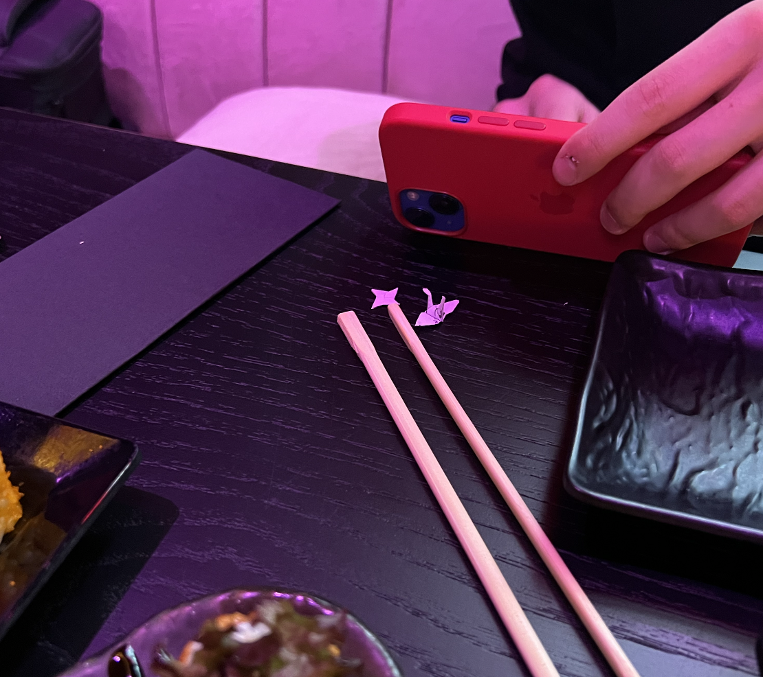 brunch at Cafe George, interesting sporks, beautiful hanging flowers by the streets, eyedrops for an irritated eye, walk with E to/from WeWork (still in school!!), shells in a bag and toast on the ground, beautiful sunset from some rooftop event, (practically) Irish goodbye-ing, random sushi restaurant dinner, mini cranes, being asked if I was on spring break, lychee martinis and a brownie, late-late night giggles on a jaunt, even later crepes
